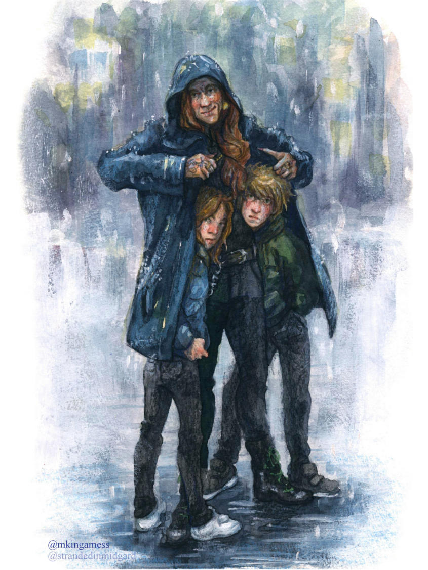 Little Narfi and Vali seeking shelter under Loki's coat. Imagine seeing them from behind. So many legs.